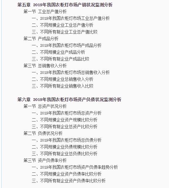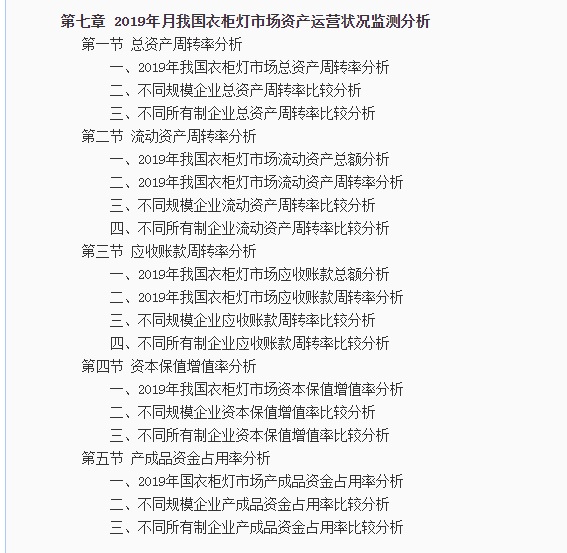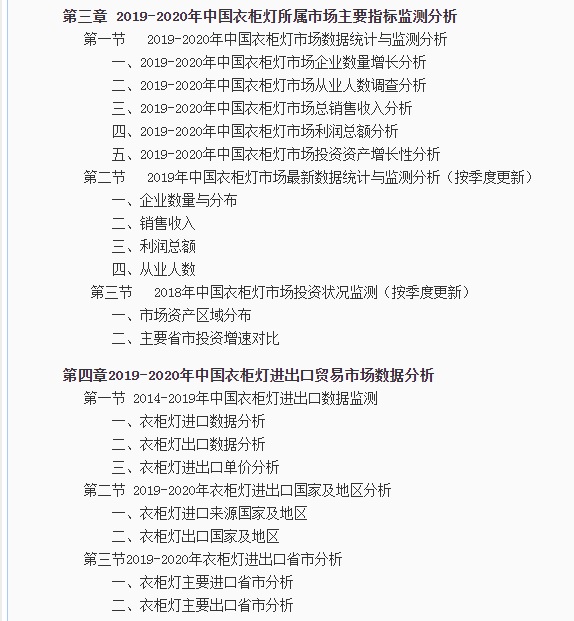 本报告重点对衣柜灯市场宏观市场及微观企业的相关数据进行监测,主要包括:产量数据统计、进出口贸易市场数据、产销状况监测、市场财务运行监测(资产负债、资产运营、成本费用、盈利能力)、重点企业竞争力及关键性数据等。本报告充分体现数据性特点,主要以定量的数据方式体现衣柜灯市场运行情况,为企事业客户提供及时准确的一手及分析数据。