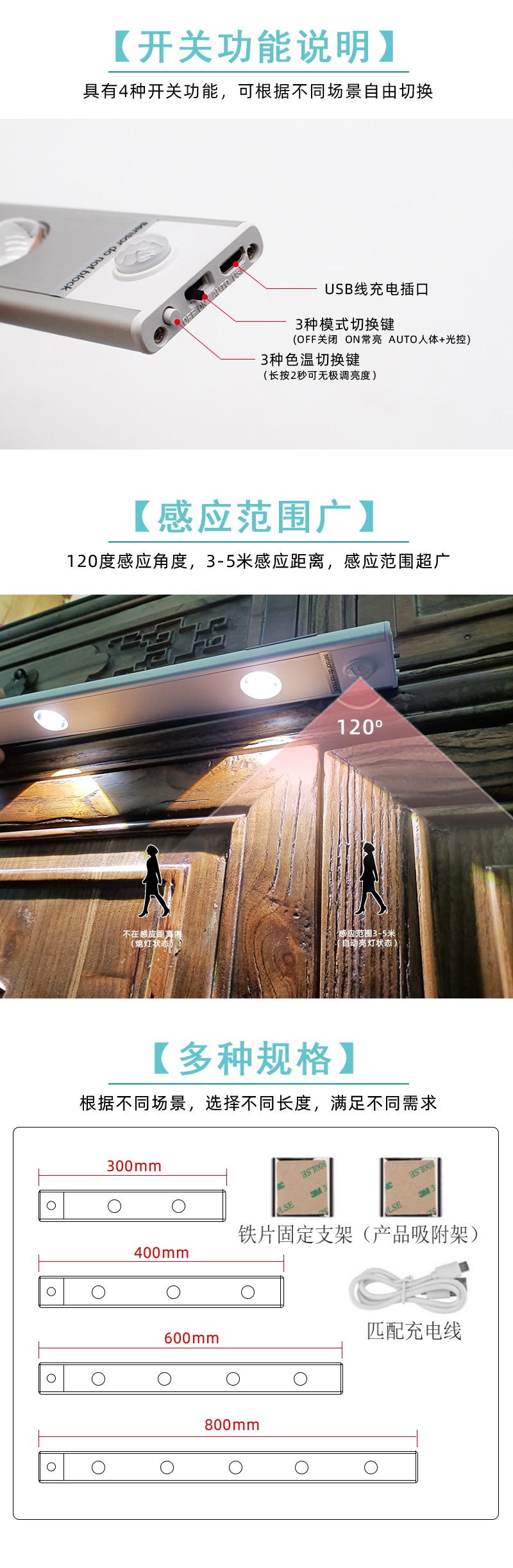 充电猫眼光效人体感应灯适用范围广,比如厨房、衣柜、书柜、玄关、背景墙、洗手池、床头床尾等可以粘贴的地方都可以。