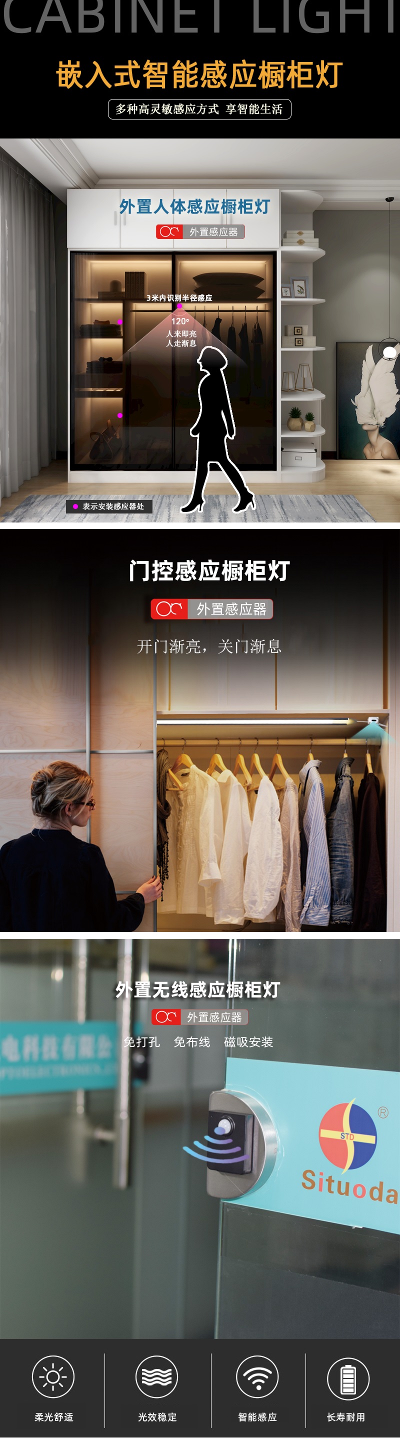 门控感应橱柜灯是由开门关门或者是门板移动来控制灯的开关的,适合各种带门的柜子内安装。