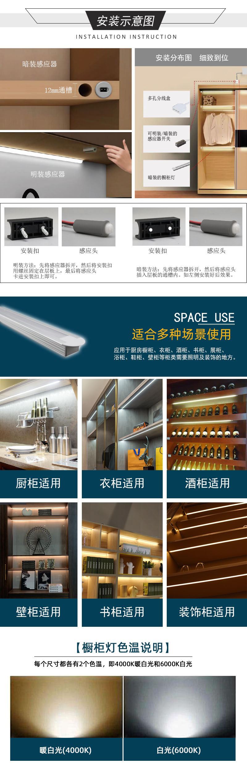 led外置门控感应橱柜灯是由橱柜灯条+外置感应器组合而来,橱柜灯是需要挖槽暗装的,感应器可以选择明装或暗装。