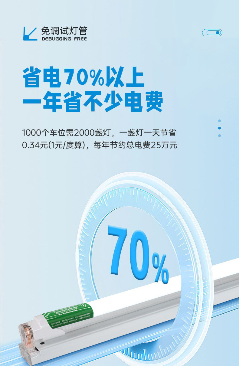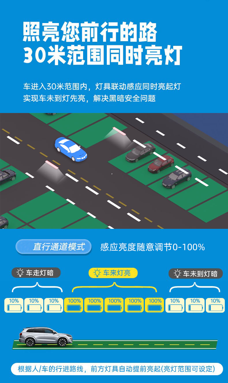 车行感应:当车辆进入感应范围,灯管亮度自动调至100%;车辆离开后,亮度逐步降至50%持续一段时间后亮度调到10%。这种智能调光模式,在节能改造中能有效避免能源浪费。
