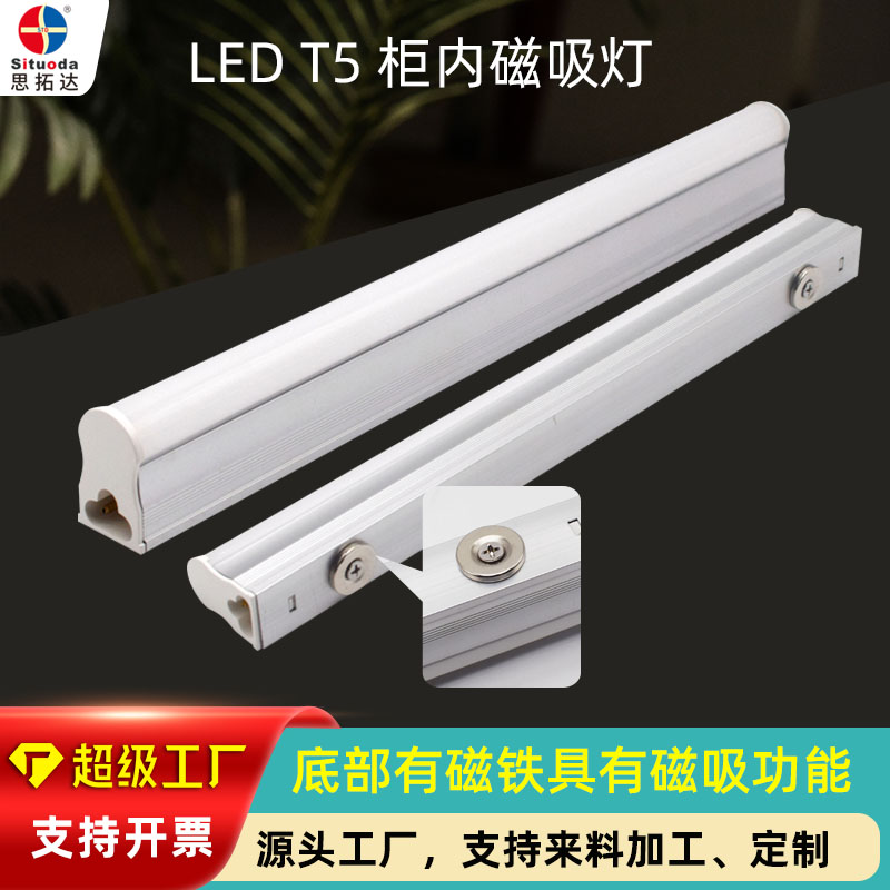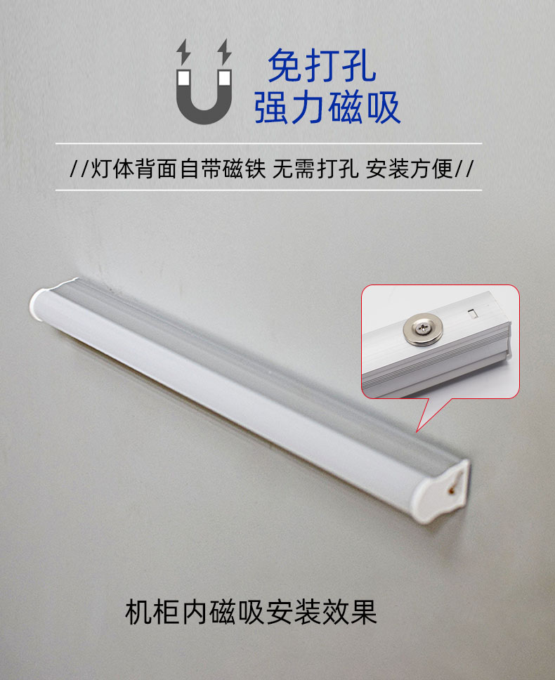 磁吸T5灯管它的亮点就是那个强磁铁底座,随便往金属表面一放就牢牢吸住,再也不用采用打孔安装的方式安装了。因为像一些机柜内是一些金属板材,不好打孔安装。有了这种磁吸设计,就可以随意吸附在所需要照明的地方。