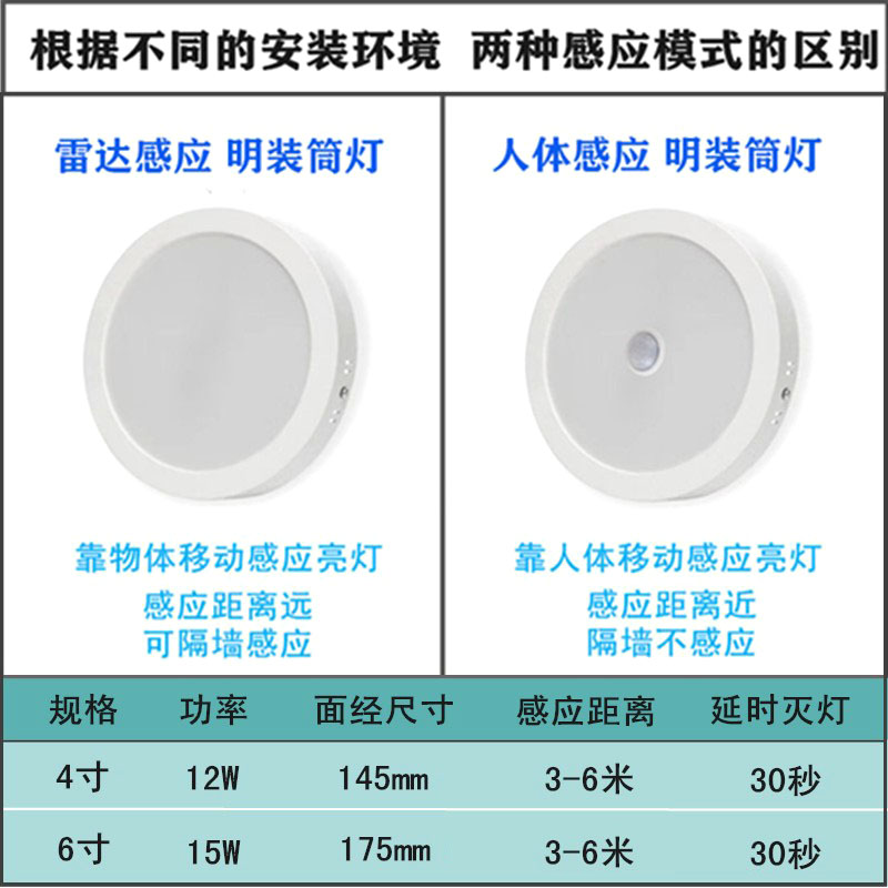 我们这款明装筒灯,不管是人体感应、雷达感应、声控感应都带有光敏感应的。意思是受光线影响,白天不亮,晚上才会亮,智能省电。现在有2个规格的:4寸 12W-(14.5cm),6寸 15W-(17.5cm)